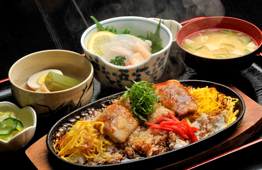 寿都産ホッケの蒲焼きをアツアツの鉄板ご飯の上にのせたご当地グルメです。