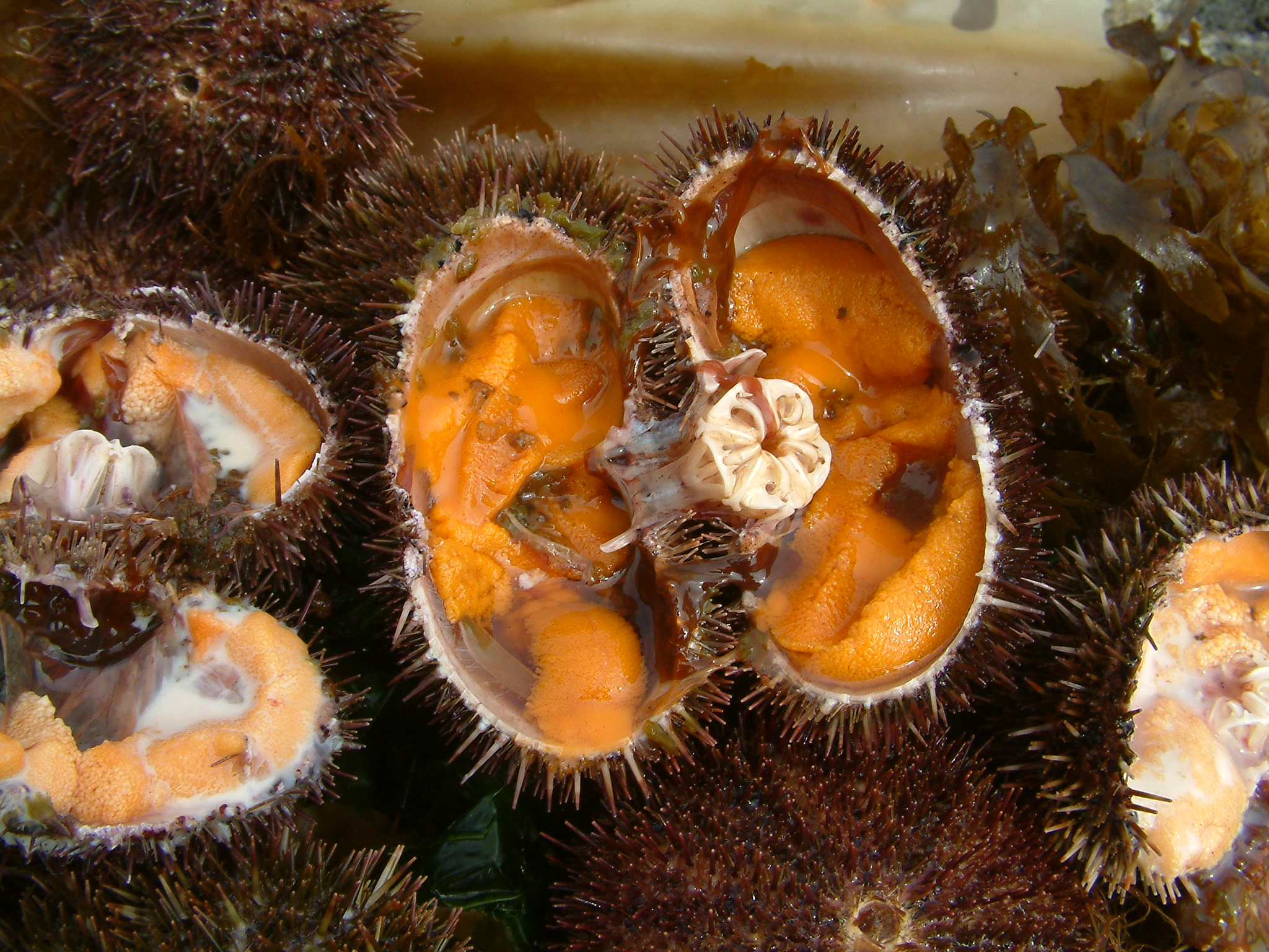利尻島では、エゾバフンウニおよびキタムラサキウニが6月〜9月の短期間に漁獲され、町の夏の味覚として親しまれております。漁は風・波の状況が良好な限られた日にのみ行われ、天然の恵みによって育まれた希少な資源です。利尻昆布を餌とすることで身に旨味が凝縮され、濃厚で上品な甘味を有しており、料亭でも高く評価されています。
