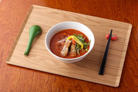 地場産トマトを使って作った自家製トマトスープに、地場産&手作りの「メバルソーセージ」、「イカ天かまぼこ」をトッピングした、非常に珍しいトマト海鮮ラーメンです。