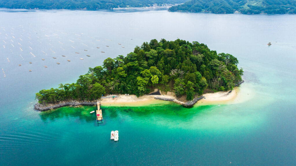 深い山々に白い砂浜、エメラルドグリーンの海。夏は比較的涼しく、冬は雪も少なく東北の中でも温暖な気候が特徴です。