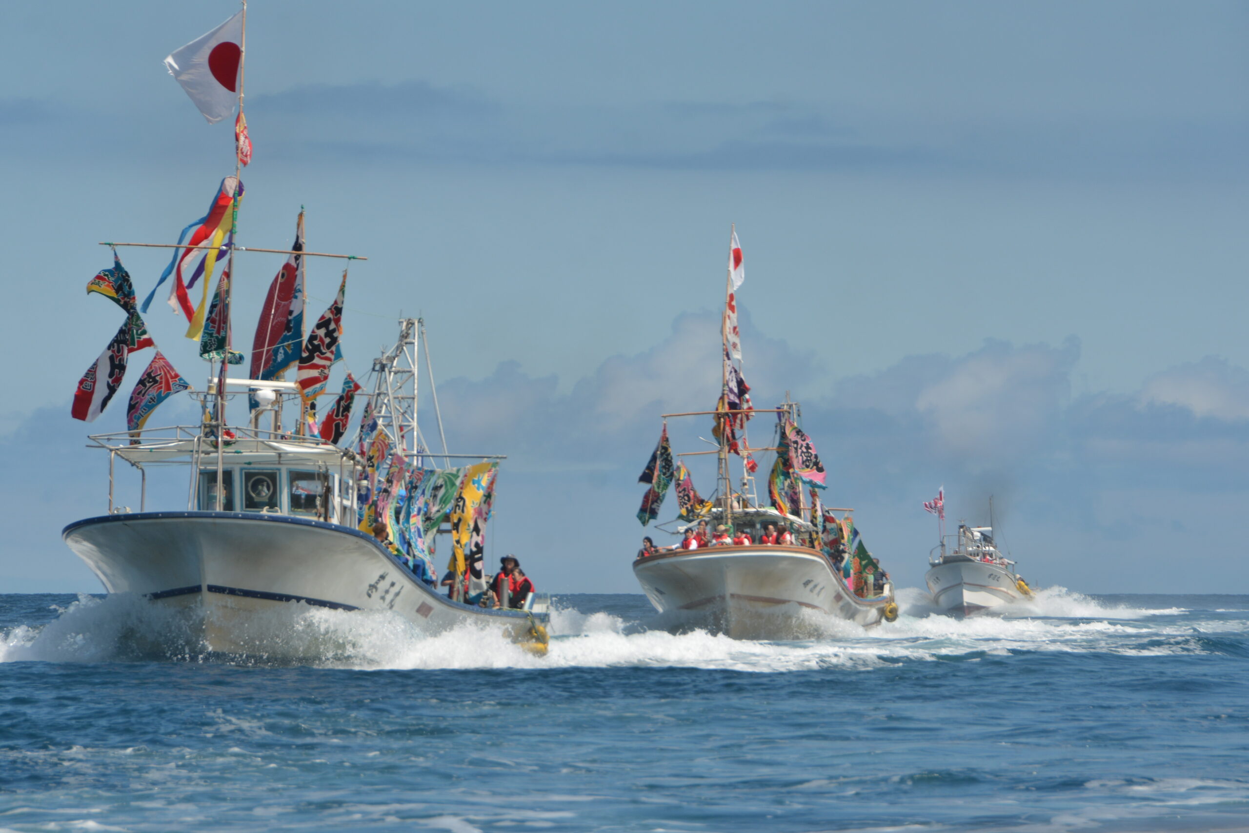 メインイベントは漁船が大漁旗をなびかせながら進む『海上船団パレード』です。